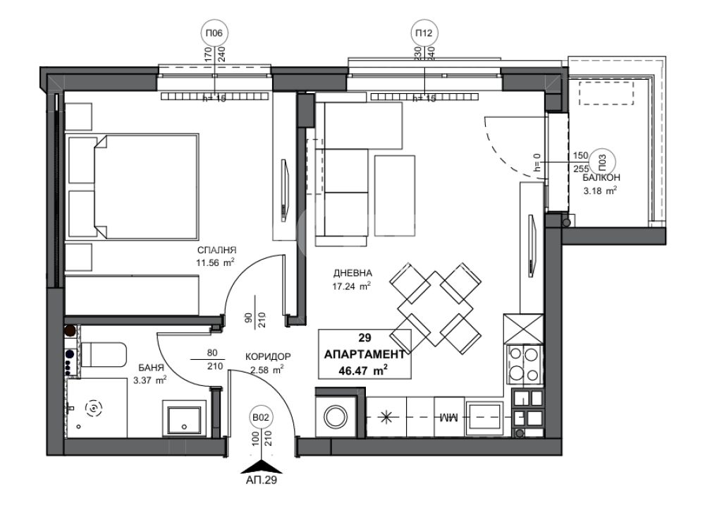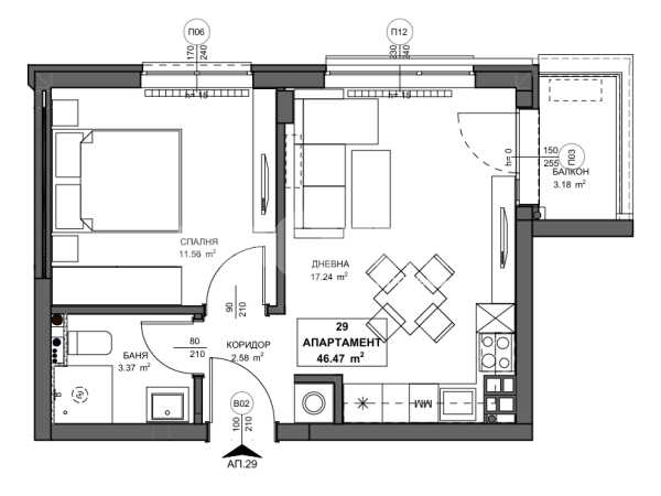 Бюджетен двустаен апартамент с РЗП- 57,06м², ЗП-46,47м² с включен склад 29-2,37м². Разпределение: коридор, дневна с кухненски бокс и трапезария, спалня, баня с тоалетна, балкон. Отопление ТЕЦ. Изложение СЕВЕР/ИЗТОК.