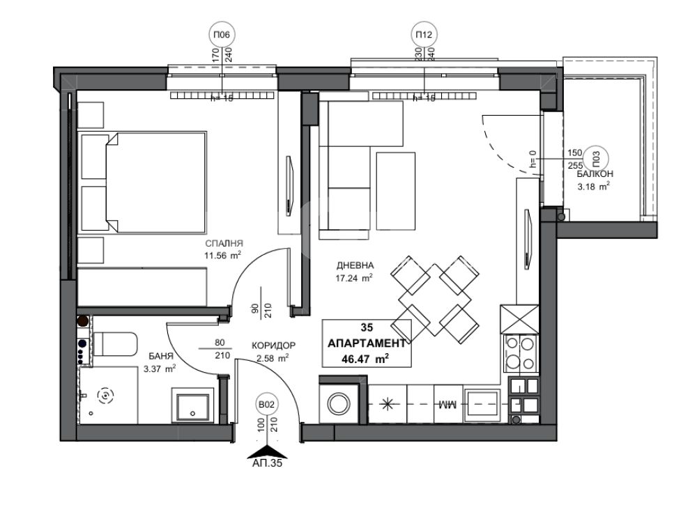 Бюджетен двустаен апартамент с РЗП- 57,35м², ЗП-46,47м² с включен склад 35-2,65м². Разпределение: коридор, дневна с кухненски бокс и трапезария, спалня, баня с тоалетна, балкон. Отопление ТЕЦ. Изложение СЕВЕР/ИЗТОК.