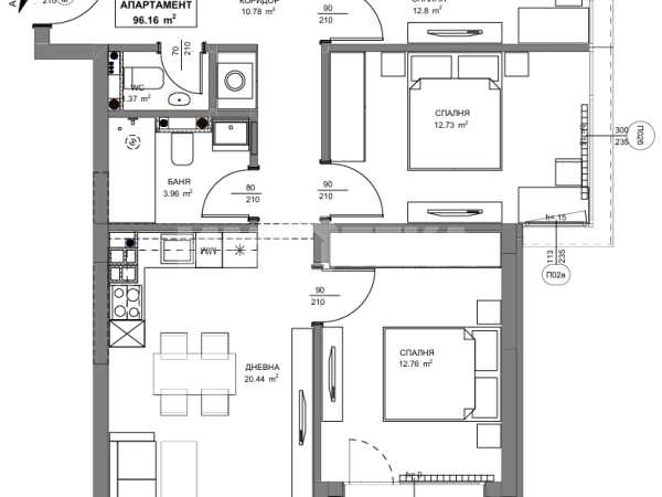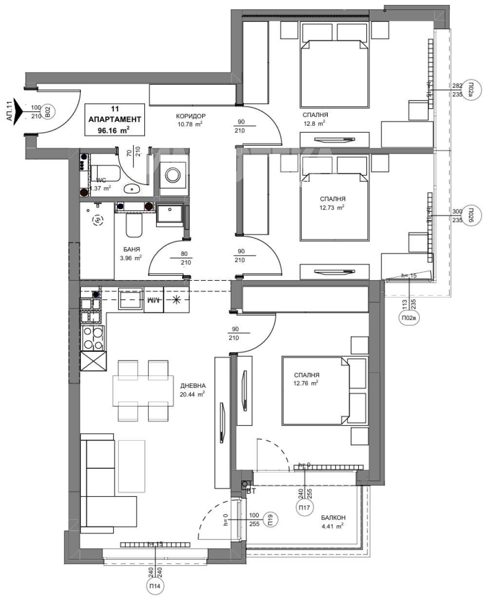 Многостаен апартамент с РЗП- 116,09м², ЗП-96,16м² с включен склад 11-2,37м². Разпределение: коридор, дневна с кухненски бокс и трапезария, три спални, баня с тоалетна, отделна тоалетна, балкон. Отопление ТЕЦ. Изложение изток/юг.