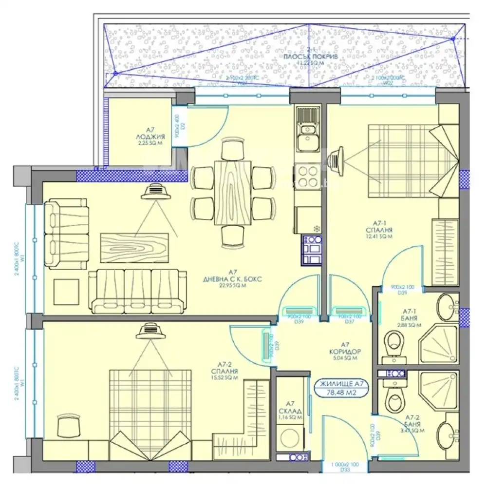 Над партерното ниво са разположени 5 изцяло жилищни етажа с общо 59 светли и функционално разпределени апартамента.