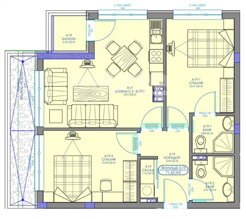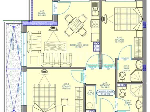Над партерното ниво са разположени 5 изцяло жилищни етажа с общо 59 светли и функционално разпределени апартамента.