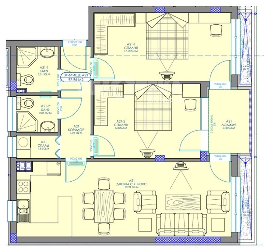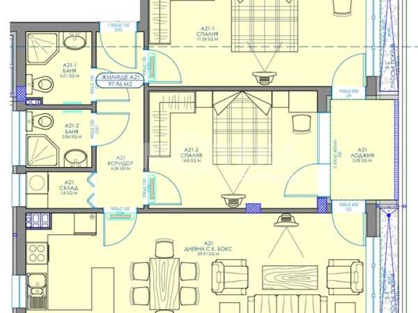 Над партерното ниво са разположени 5 изцяло жилищни етажа с общо 59 светли и функционално разпределени апартамента.