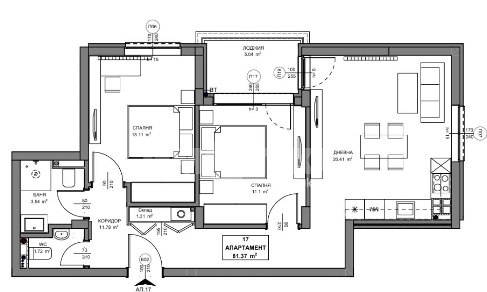 Тристаен апартамент с РЗП- 95,42м², ЗП-81,37м² . Разпределение: коридор, дневна с кухненски бокс и трапезария, две спални, баня с тоалетна, отделна тоалетна, лоджия. Отопление ТЕЦ. Изложение изток/север.