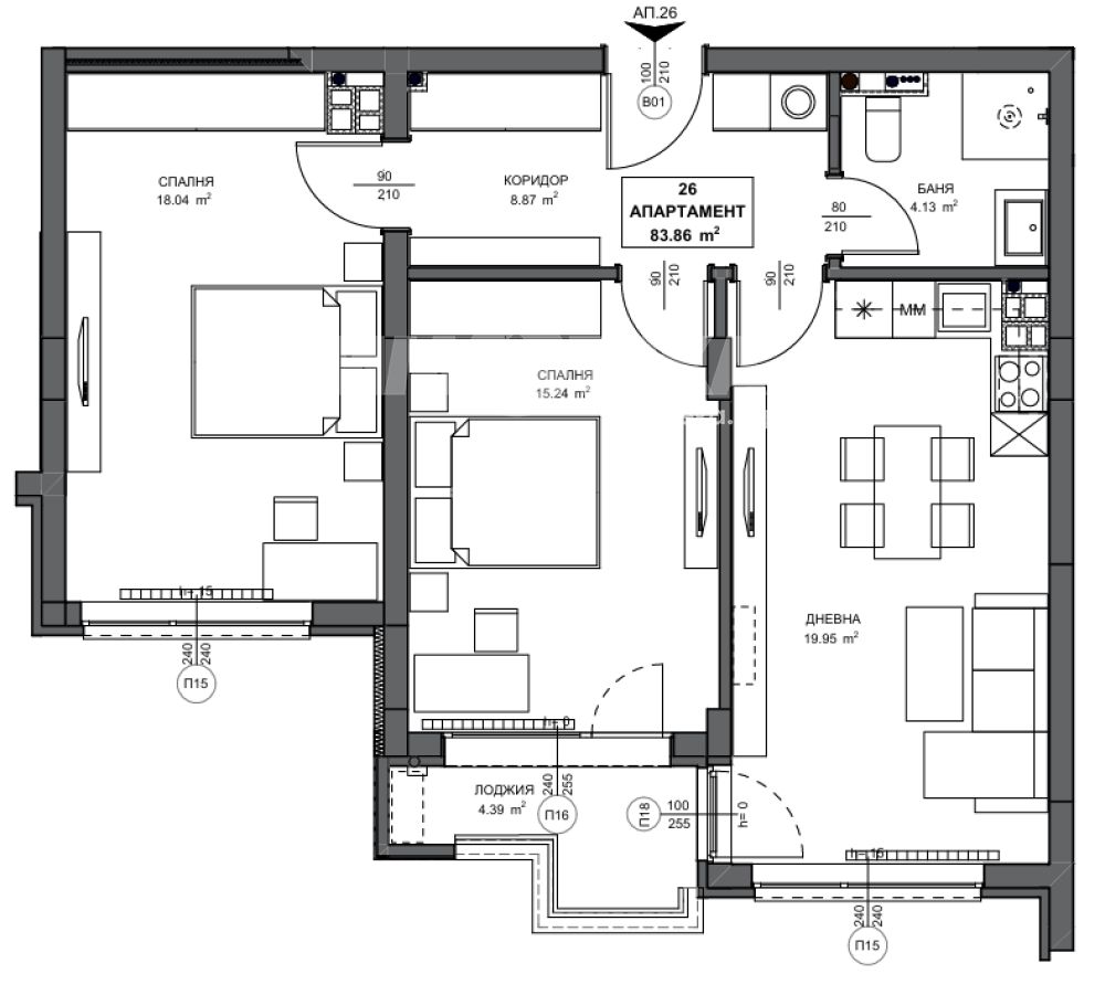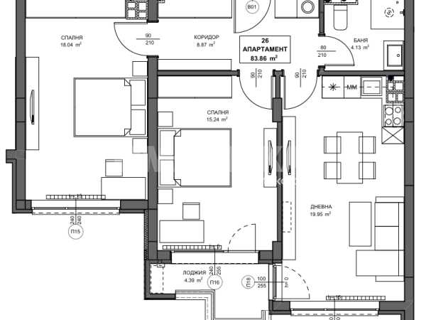 Тристаен апартамент с РЗП- 101,70м², ЗП-83,86м², с включен склад 26-2,37м². Разпределение: коридор, дневна с кухненски бокс и трапезария, две спални, баня с тоалетна, място за пералня, лоджия. Отопление ТЕЦ. Изложение ЮЖНО.