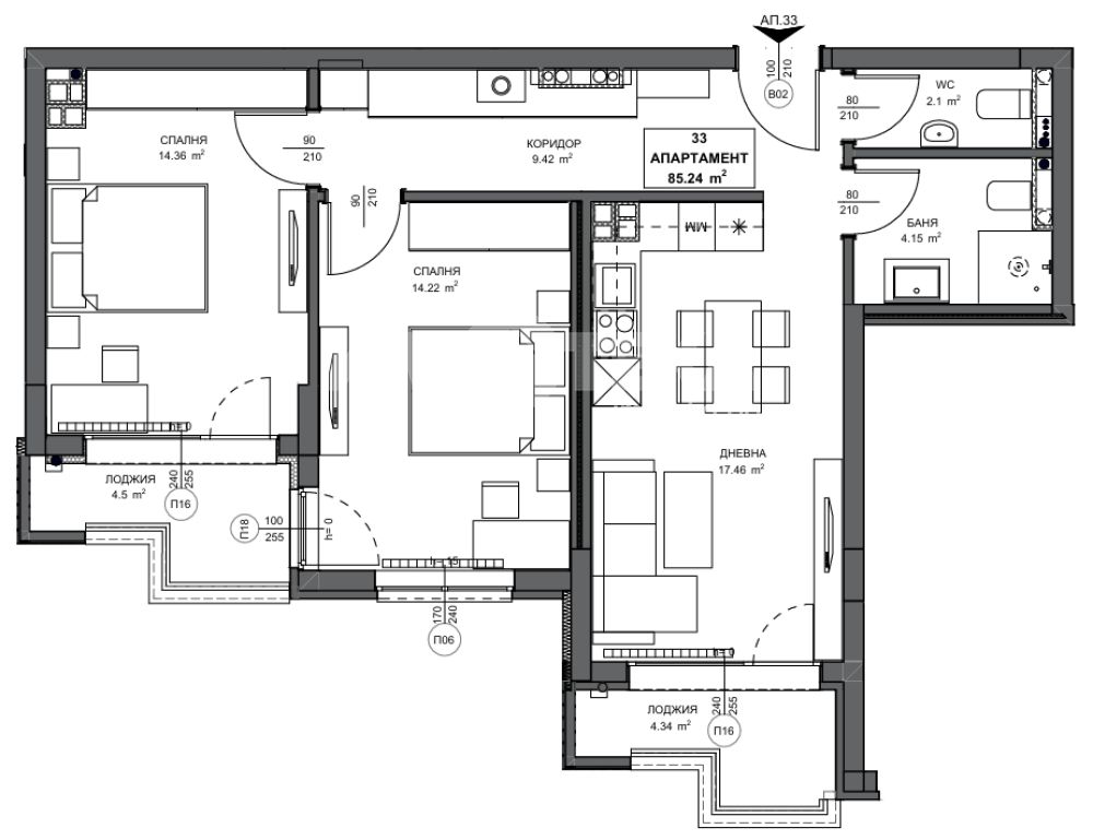 Тристаен апартамент с РЗП- 103,55м², ЗП-85,24м², с включен склад 33-2,57м². Разпределение: коридор, дневна с кухненски бокс и трапезария, две спални, баня с тоалетна, отделна тоалетна, две лоджии. Отопление ТЕЦ. Изложение ЮЖНО.