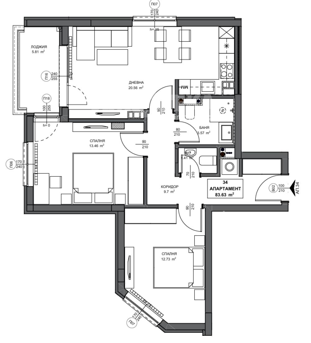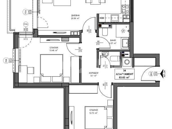 Тристаен апартамент с РЗП- 100,94м², ЗП-83,63м² с включен склад 34 -2,56м². Разпределение: коридор, дневна с кухненски бокс и трапезария, две спални, баня с тоалетна, отделна тоалетна, лоджия. Отопление ТЕЦ. Изложение -ЮГ /ЗАПАД/СЕВЕР.