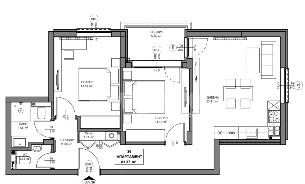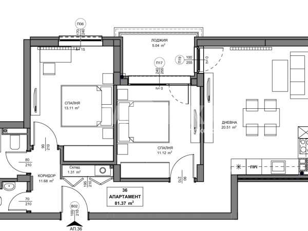 Тристаен апартамент с РЗП-95,42м², ЗП-81,37м². Разпределение: коридор, дневна с кухненски бокс и трапезария, две спални, баня с тоалетна, отделна тоалетна, лоджия. Отопление ТЕЦ. Изложение изток/север