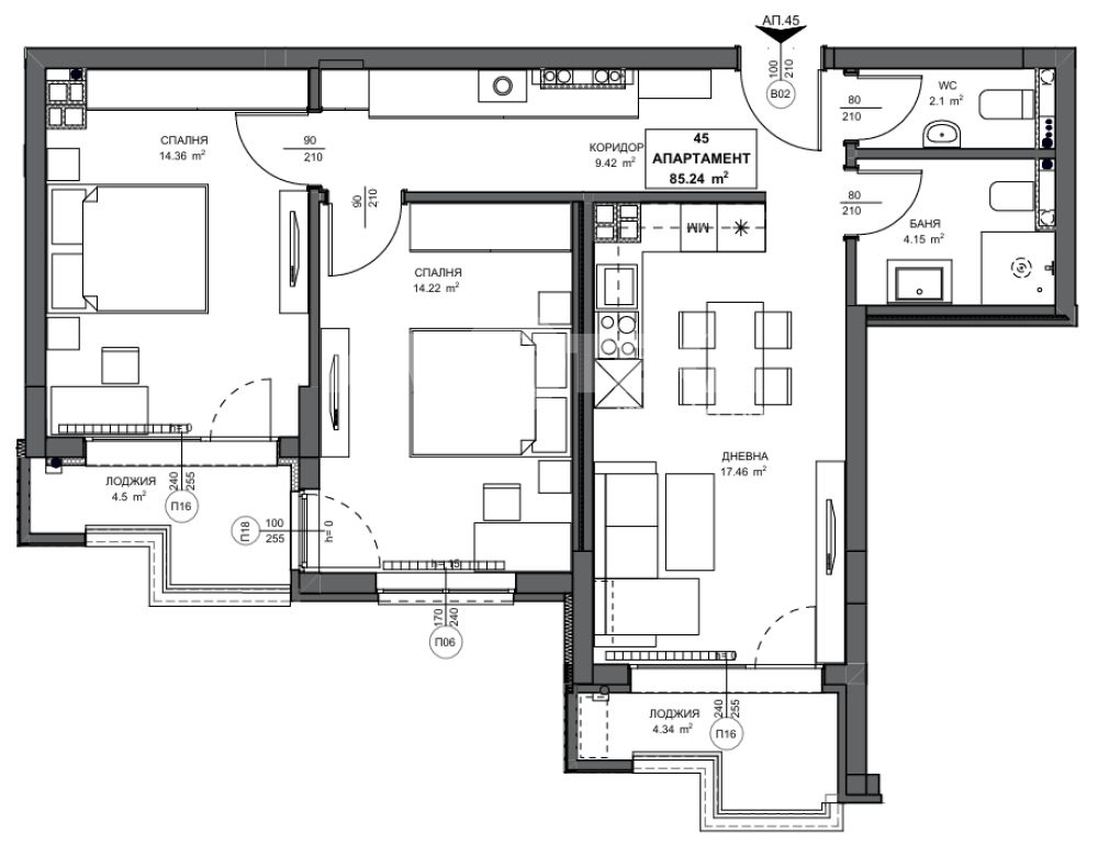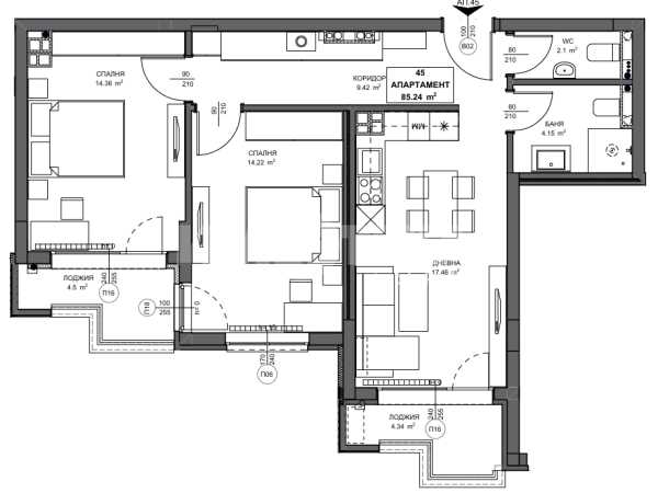 Тристаен апартамент с РЗП- 102,42м², ЗП-85,24м² с включен склад 45 -2,37 м². Разпределение: коридор, дневна с кухненски бокс и трапезария, две спални, баня с тоалетна, отделна тоалетна, две лоджии. Отопление ТЕЦ. Изложение -ЮГ.