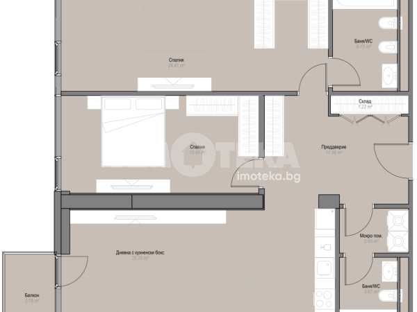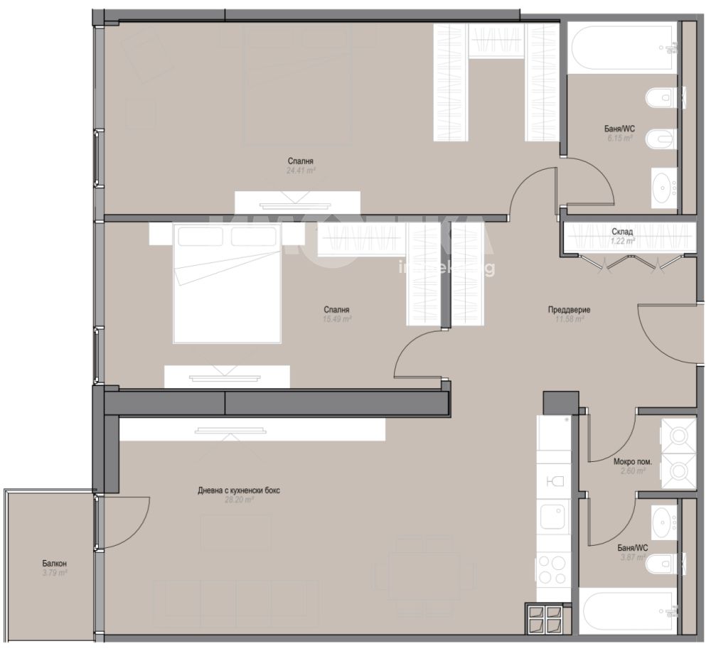 Апартаментът се състои от 2 спални- към едната от спалните има прилежаща баня с WC и гардеробна; дневна с трапезария и кухненски бокс, 2 бани с WC;мокро помешение; входно антре със складово помещение ; тераси. Изложение – Северозапад