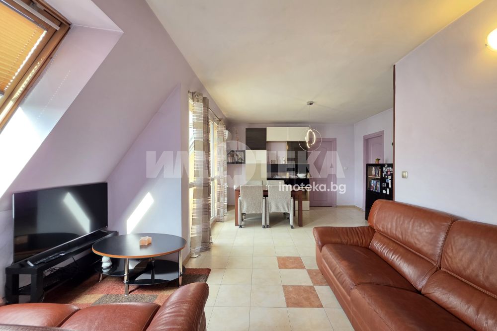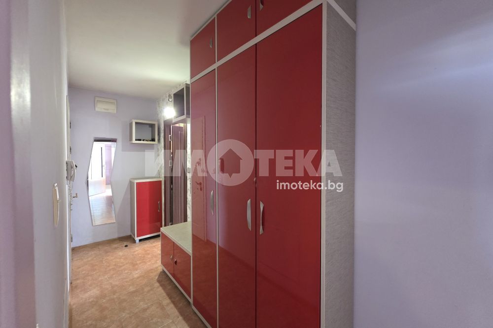 Тристаен апартамент с площ от 105 кв.м състоящ се от: коридор, дневна с трапезария и кухнески бокс,източен балкон, две спални, едната с изложение - изток, а другата е западна с широк балкон, наскоро ремонтирана баня с тоалетна.