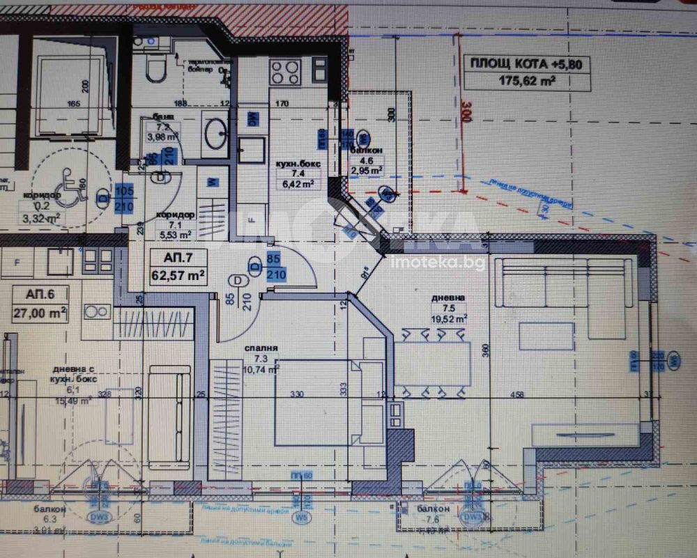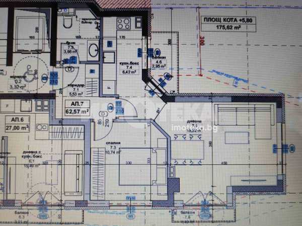 Двустаен апартамент , състоящ се от дневна с отделен кухненски бокс, спалня , баня с тоалетна , склад , два балкона, РЗП 86 кв.м.(чиста площ 62 кв.м. и склад 4 кв.м.) , първи етаж . Изложение юг/изток.