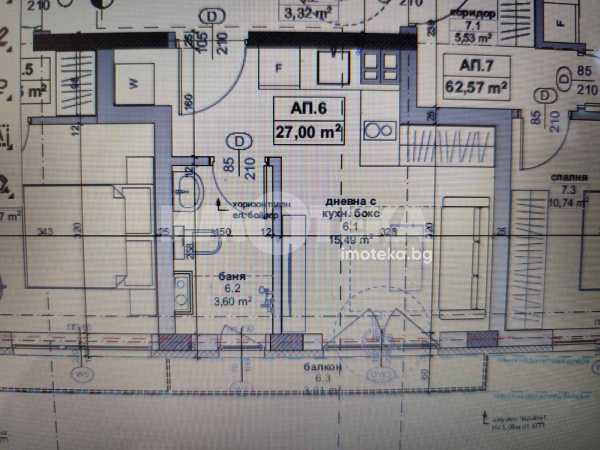 Едностаен апартамент , състоящ се от дневна с кухненски бокс , баня с тоалетна , склад , РЗП 38 кв.м.(чиста площ 27 кв.м. и склад 2,5 кв.м.) , втори етаж . Изложение юг.