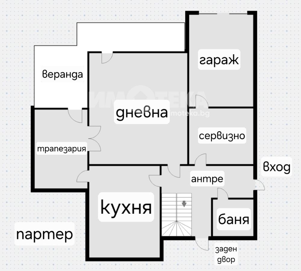 Имотът е за ремонт,което дава отлична възможност за преустройство и модернизация според предпочитанията на новия собственик.Разполага с голям гараж с топла връзка към къщата.