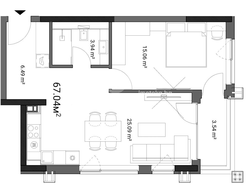 Двустаен апартамент . От входно антре с място за склад се влиза в Дневна зона, която може да се зонира на кухненски бокс с трапезария и холна част; спалня - 15 кв.м ; тераса; баня с тоалетна.