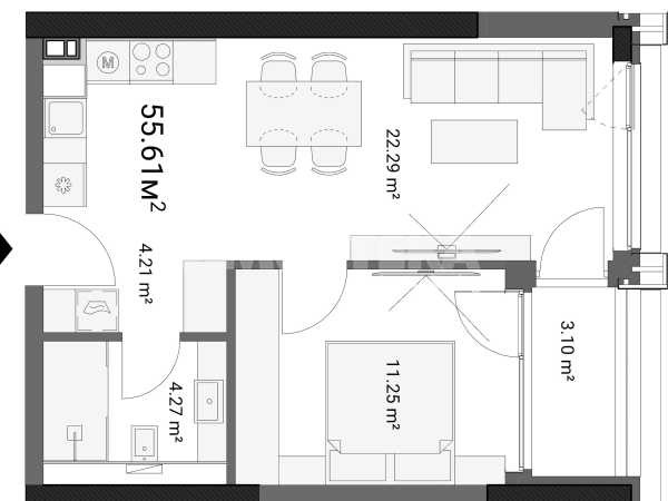 Двустаен апартамент . От входно антре с място за склад се влиза в Дневна зона, която може да се зонира на кухненски бокс с трапезария и холна част; спалня ; тераса с излаз и от двете стаи; баня с тоалетна. Апартаментът е със статут на Ателие поради неблагоприятно изложение. Бюджетен вариант подходящ за инвестиция с цел отдаване под наем.