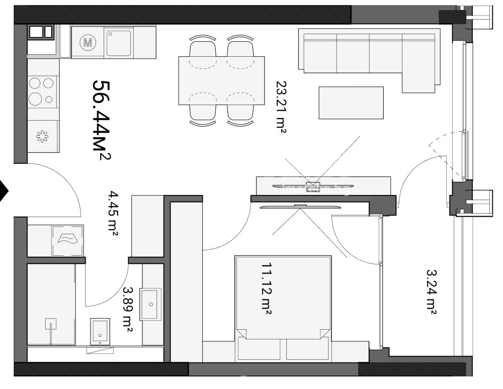 Двустаен апартамент . От входно антре с място за склад се влиза в Дневна зона, която може да се зонира на кухненски бокс с трапезария и холна част; спалня ; тераса с излаз и от двете стаи; баня с тоалетна. Апартаментът е със статут на Ателие поради неблагоприятно изложение. Бюджетен вариант подходящ за инвестиция с цел отдаване под наем.