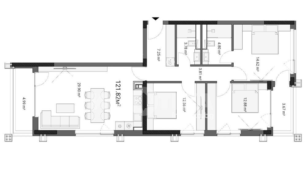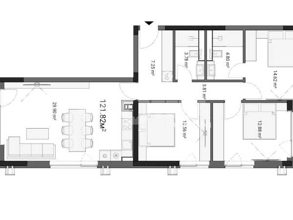Многостаен апартамент с три непреходни спални и три изложения.Светла дневна зона -30кв.м, две бани с тоалетна, входно антре с място за съхранение - 7кв.м.