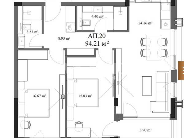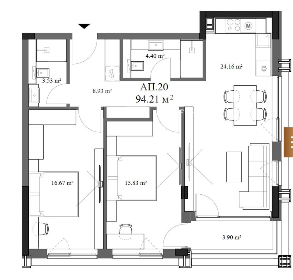 Тристаен южен апартамент. Състои се от входно антре , кухненски бокс с трапезария и дневна, две големи спални - 16/17м2, две бани с тоалетна, тераса. Дневната е много светла, с две изложения - изток/юг.