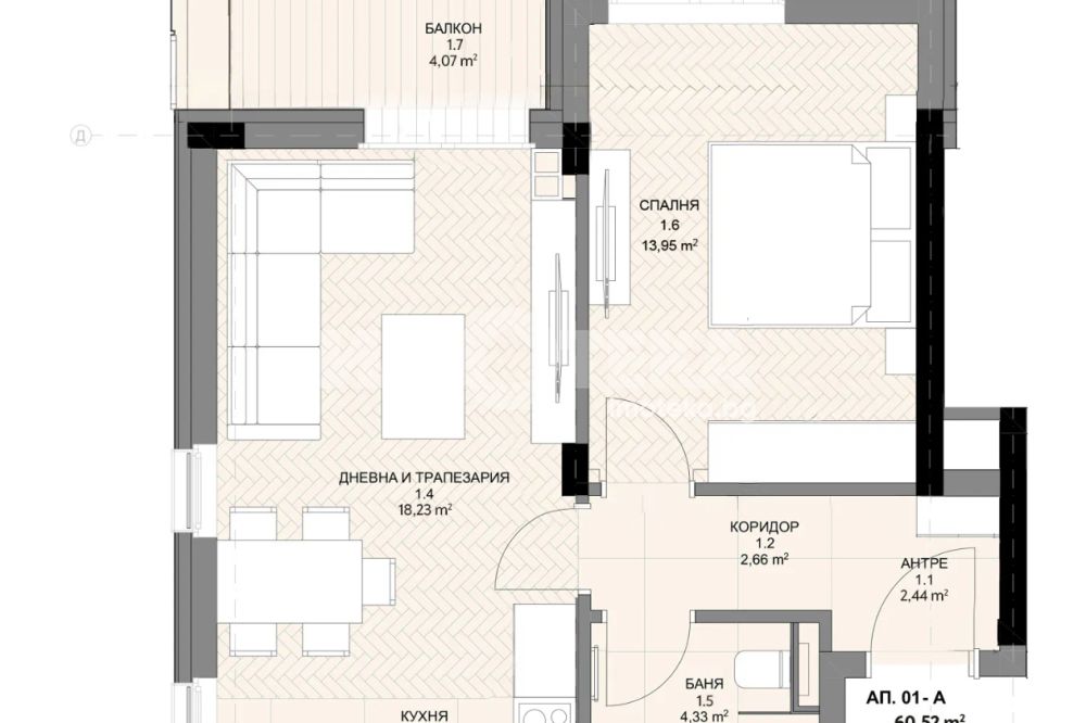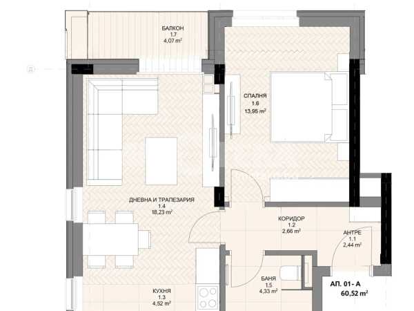 Двустаен апартамент със следното разпределение: коридор, дневна с кухненски бокс, спалня, баня с тоалетна и тераса. Чиста жилищна площ 60 кв.м.