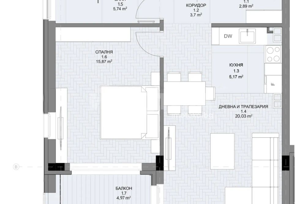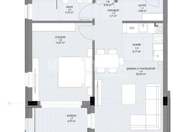 Двустаен апартамент със следното разпределение: коридор, дневна с кухненски бокс, спалня, баня с тоалетна и тераса.