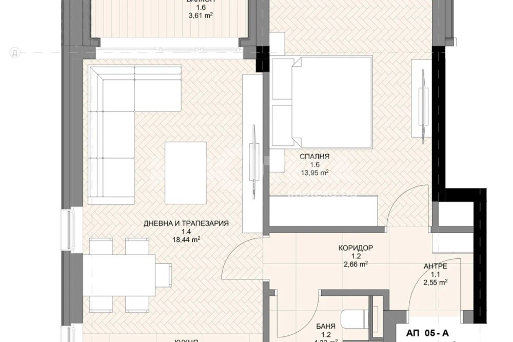 Двустаен апартамент със следното разпределение: коридор, дневна с кухненски бокс, спалня, баня с тоалетна и тераса.