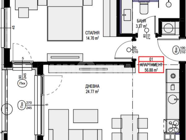 Двустаен апартамент със западно изложение, състоящ се от антре, дневна с