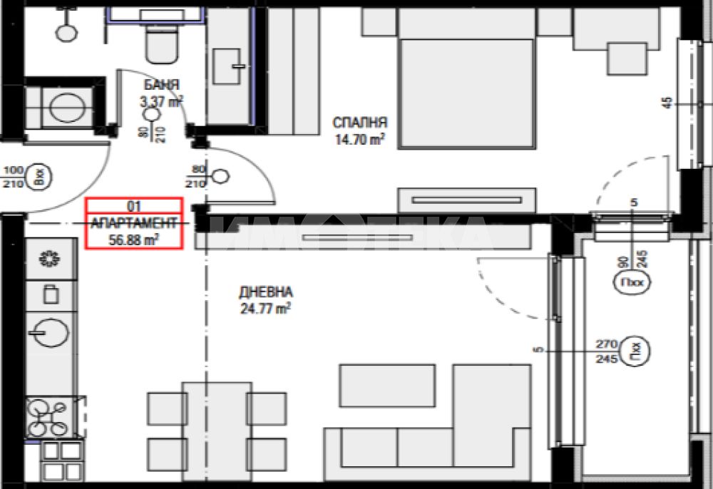 Двустаен апартамент, с източно изложение, състоящ се от антре, дневна с