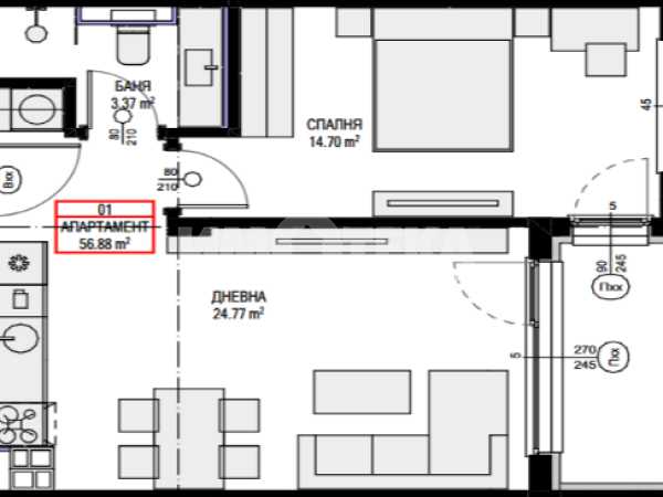 кухненски бокс, спалня, баня с тоалетна и тераса. Към апартамента има прилежащ склад - 3 кв.м