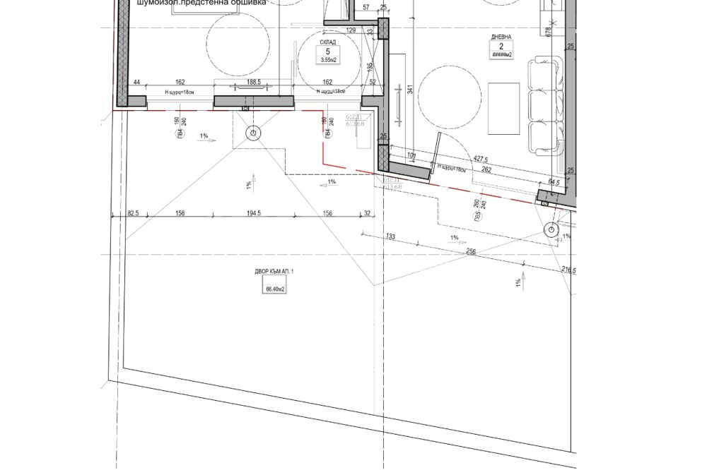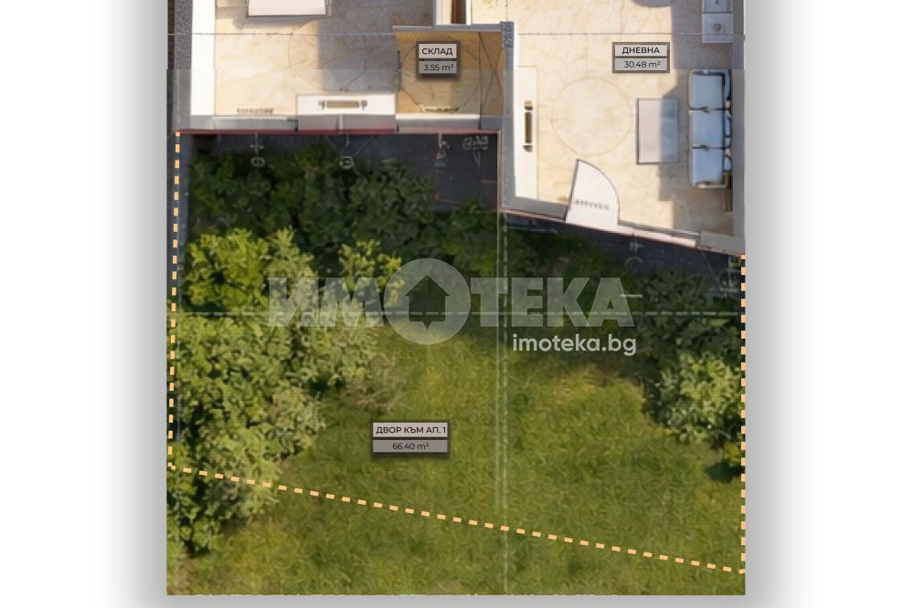 Предлагаме за продажба прекрасен двустаен апартамент със ЗП 84,56 кв.м. и собствен двор 66,40 кв.м. и разпределение както следва: всекидневна с кухненски бокс, просторна спалня, склад, коридор, баня и прилежащ двор. Ю/И изложение.