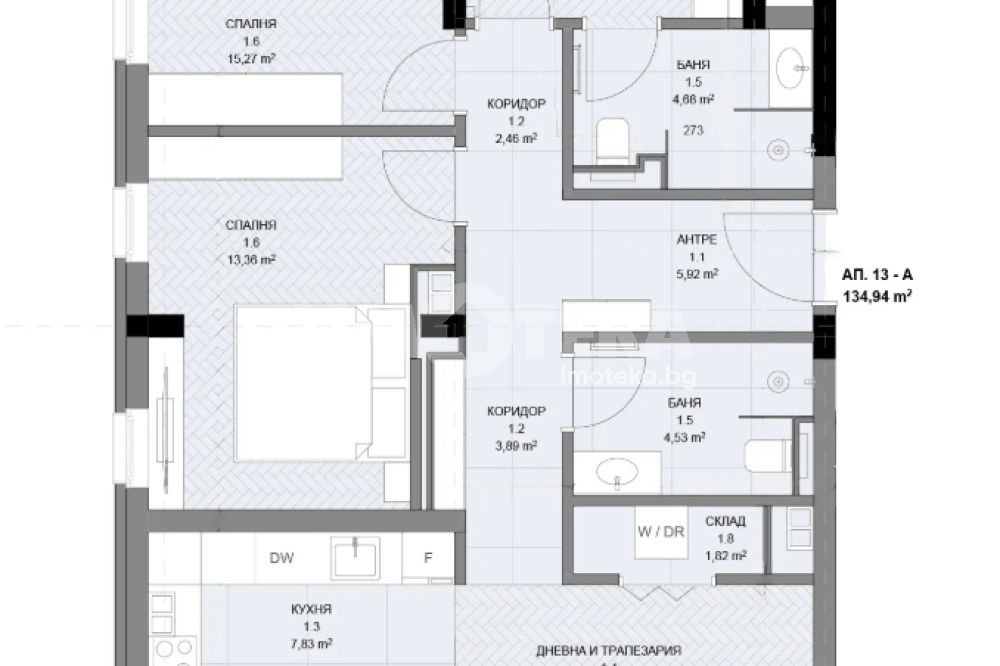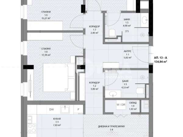 Многостаен апартамент със следното разпределение: коридор, дневна с кухненски бокс, три спални , две бани с тоалетна и две тераси.