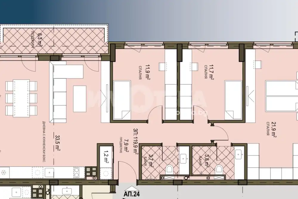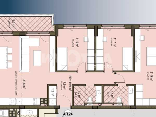 Четиристаен ап. 145кв.м., със следното разпределение - предверие, хол с