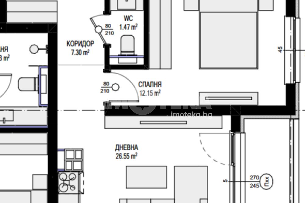 бокс, две спални, тераса, баня с тоалетна и