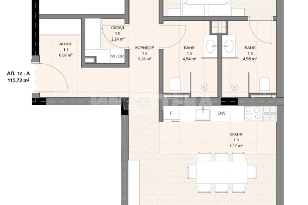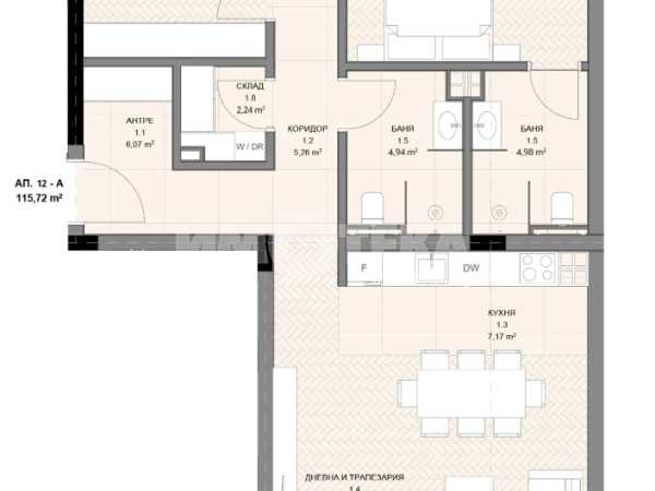 Тристаен апартамент със следното разпределение: коридор, дневна с кухненски бокс, две спални, две бани с тоалетна, склад и две тераси.