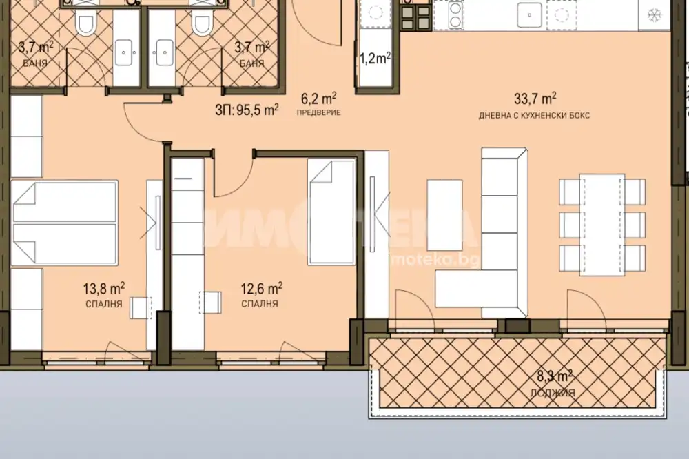 кухненски бокс и трапезария, две спални, две бани с тоалетна, мокро