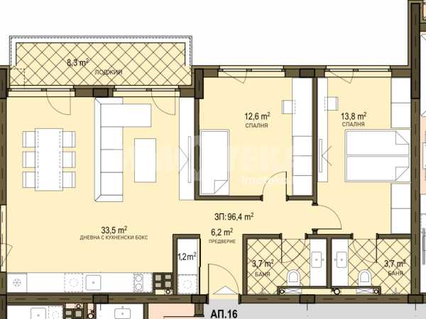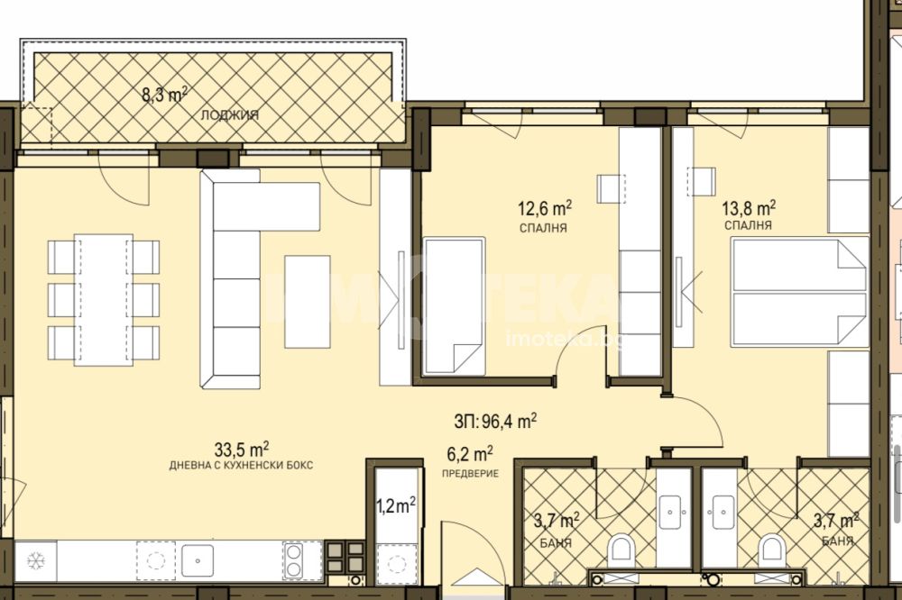 кухненски бокс и трапезария, две спални, две бани с тоалетна, мокро