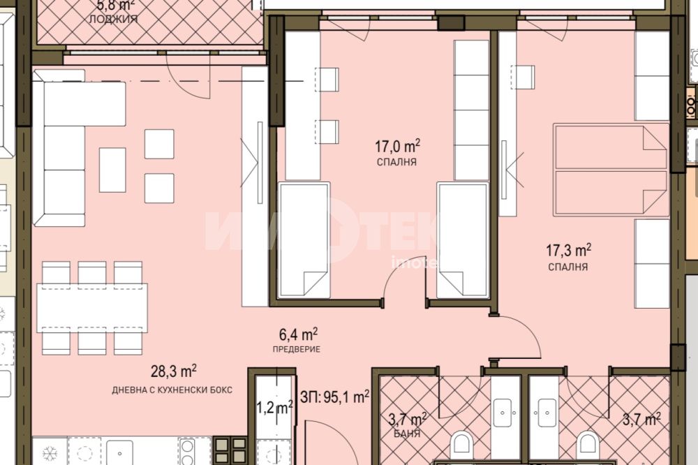 кухненски бокс и трапезария, две спални, две бани с тоалетна, мокро
