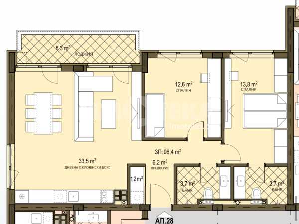 кухненски бокс и трапезария, две спални, две бани с тоалетна, мокро