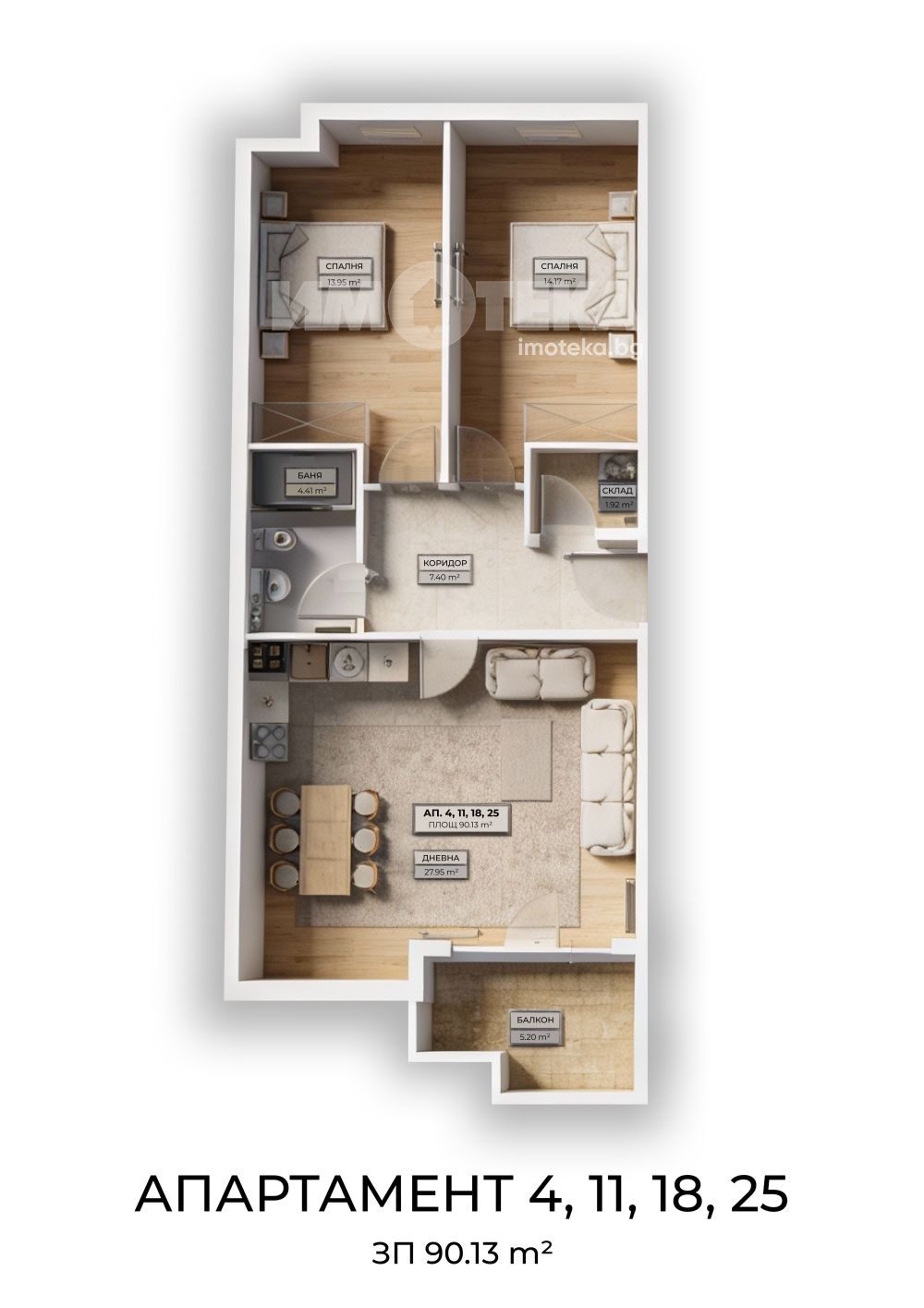 Предлагаме за продажба прекрасен тристаен апартамент със ЗП 90,13 кв.м. и разпределение както следва: всекидневна с кухненски бокс, две комфортни спални, склад, коридор, баня с тоалетна и балкон. СЗ / ЮИ изложение.