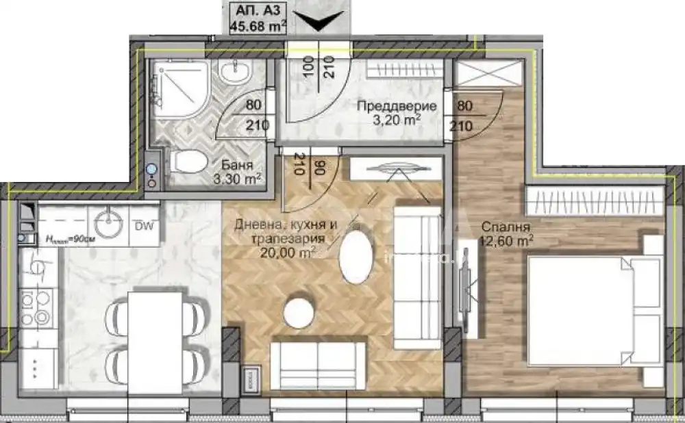 Двустаен апартамент с югозападно изложение и с чиста площ 45,68 кв.м. Състои се от хол, трапезария и кухненски бокс - 20 кв.м., спалня - 9,75 кв.м. и мазе 1,68 кв.м.