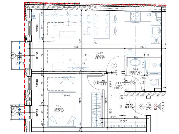 Двустаен апартамент на етаж пети с РЗП-69,60м2, ЗП-59,01м2 и разпределение: антре, дневна с кухненски бокс и трапезария-24,58м2, спалня-12,80м2, баня с тоалетна-3,91м2, и два балкона. Отпление ГАЗ. Налични ПМ и гаражи. Цените са крайни с включен ДДС.