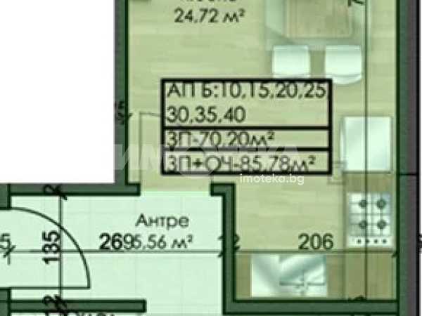 Апартамента се намира на ет.2 над гаражи с изложение север/запад със застр.площ от 51.31 кв.м 64.48 кв.м с общи части. Състои се от антре 4 кв.м, дневна с кухненски бокс 22.57кв.м ,спалня 12 кв.м с тераса 3.20 кв.м и баня с тоалетна 3.01 кв.м. Посочените квадратури са чистата светла площ на помещенията. Има апартаменти със същото разпределение и на горните етажи,като цената е според етажа. На горния етаж е 2400е на кв.м на ет.4 ,2500е на кв.м и така до ет.9. Отоплението предвидено за всеки 1 ап е с изводи за индивидуални газови котлета и изградени трасета за климатици сплит система във всяка стая и изводи за главния климатик на терасата. В градата има още много варианти на 2стайни и 3 стайни апартаменти, като съществува и вариант за обединение на апартаменти. Сградата е с акт 14 от миналата година. Акт 16 се предвижда преди края на 2026г.
