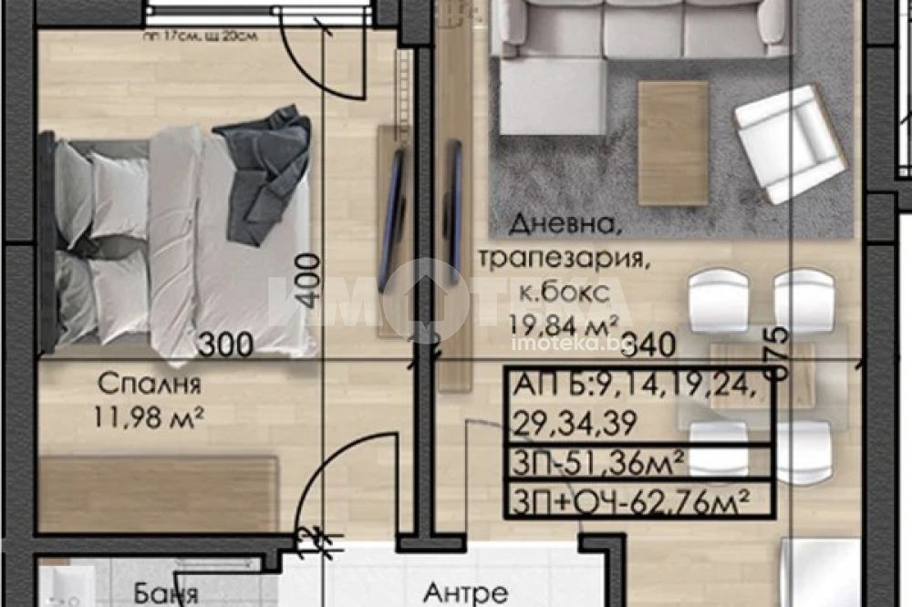 Апартамента се намира на ет.5/10 среден,вътрешен с югоизточно изложение.Застроената площ е 51.36кв.м ,62.76 кв.м с общи части.Състои се от антре 4.64кв.м, непр.спалня 12кв.м, и дневна с бокс 20 кв.м и баня с тоалетна 3 кв.м. Пред спалнята има тераса 3.32кв.м на ,която се излиза от 2те помещения . Посочените квадратури на скицата са чистата светла площ на помещенията. Сградата е с акт 14, акт 16 до края на 2026г.
