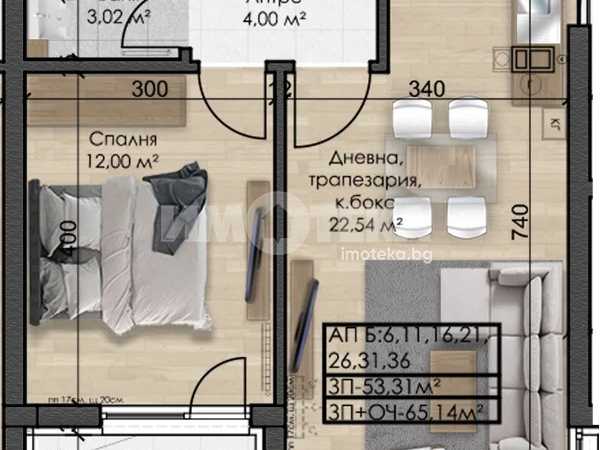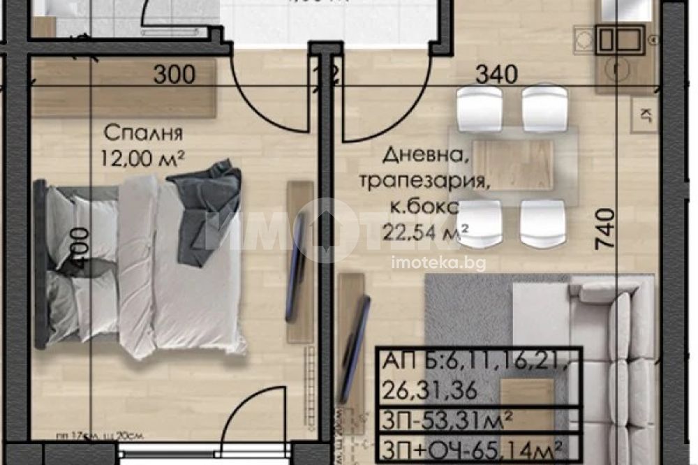 Апартамента се намира на ет.3 с изложение север/запад със застр.площ от 53.31 кв.м 65.14 кв.м с общи части. Състои се от антре 4 кв.м, дневна с кухненски бокс 22.54кв.м ,спалня 12 кв.м с тераса 3.20 кв.м и баня с тоалетна 3.01 кв.м. Посочените квадратури са чистата светла площ на помещенията. Има апартаменти със същото разпределение и на горните етажи,като цената е според етажа. На горния етаж е 2400е на кв.м . Отоплението предвидено за всеки 1 ап е с изводи за индивидуални газови котлета и изградени трасета за климатици сплит система във всяка стая и изводи за главния климатик на терасата. В градата има още много варианти на 2стайни и 3 стайни апартаменти, като съществува и вариант за обединение на апартаменти. Сградата е след акт 14. Правят се фасадите,които са окачени и се работи по общите части.Сградата ще бъде предадена с акт 16 до началото на м. Декември 2026г