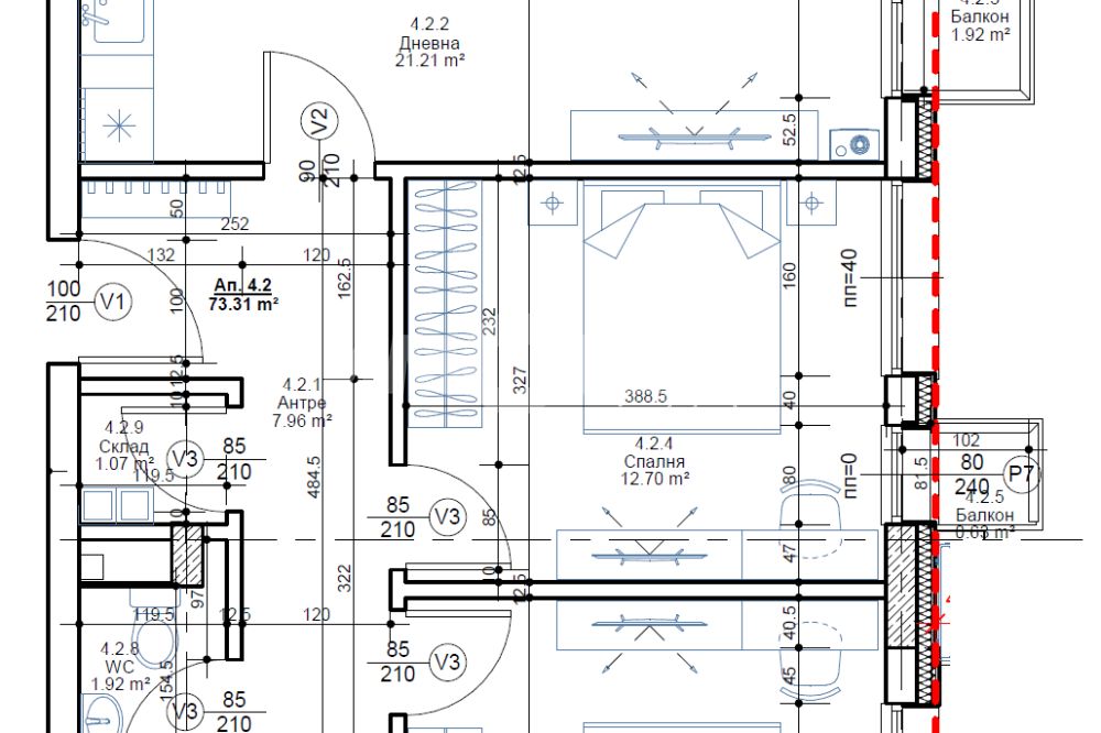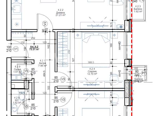 Тристаен апартамент на етаж четири с РЗП-87,85м2, ЗП-73,31м2 и разпределение: антре, дневна с кухненски бокс и трапезария-21,21м2, две спални-12,70 и 11,97м2, баня с тоалетна-3,57м2, отделна тоалетна, склад и два балкона. Отпление ГАЗ. Налични ПМ и гаражи. Цените са крайни с включен ДДС.