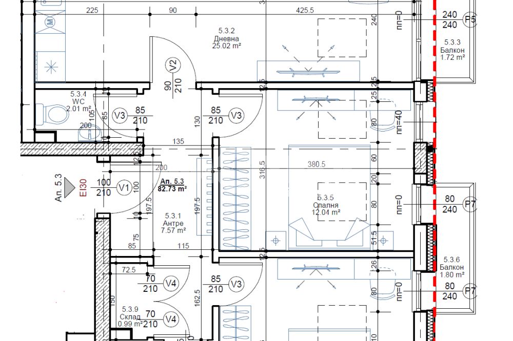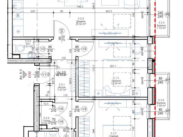 Тристаен апартамент на етаж пети с РЗП-98,18м2, ЗП-82,73м2 и разпределение: антре, дневна с кухненски бокс и трапезария-25,02м2, две спални-12,04 и 13,17м2, баня с тоалетна-4,49м2, отделна тоалетна, склад и два балкона. Отпление ГАЗ. Налични ПМ и гаражи. Цените са крайни с включен ДДС.