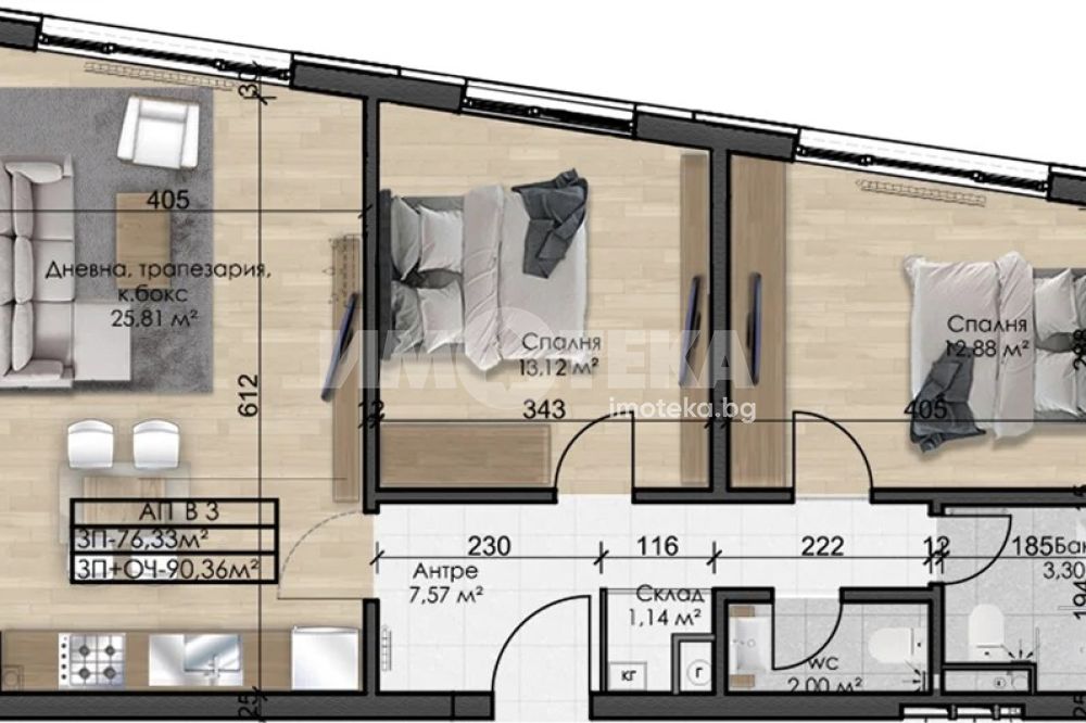 Апартамента се намира на ет.2/10 с изложение югозапад със застр.площ от 76.33кв.м 90.36 кв.м с общи части- среден вътрешен с южно изложение. Състои се от антре 7.70кв.м, дневна с кухненски бокс 25.80кв.м , баня с тоалетна над и отделно тоалетна, две непреходни спални 13.12кв.м и 12 .88кв.м . Посочениете квадратури са чистата светла площ на помещенията. Има апартаменти със същото разпределение и на горните етажи,като цената е според етажа. Има свободни апартаменти с такова разпределение и на по високи етажи. Отоплението предвидено за всеки 1 ап е с изводи за индивидуални