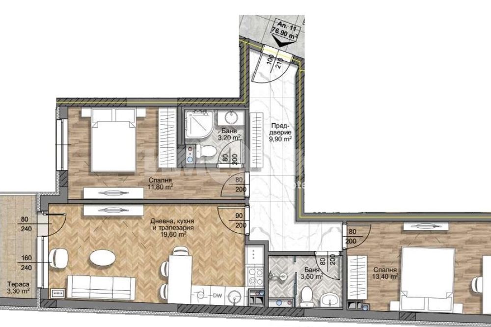 Тристаен апартамент изложение изтжк-запад и с чиста площ 76,90 кв.м. Състои се от дневна с кухня и трапезария- 19,50 кв.м., две спални съответно по 11,80 кв.м. и 13,40 кв.м., западна тераса 3,30 кв.м.