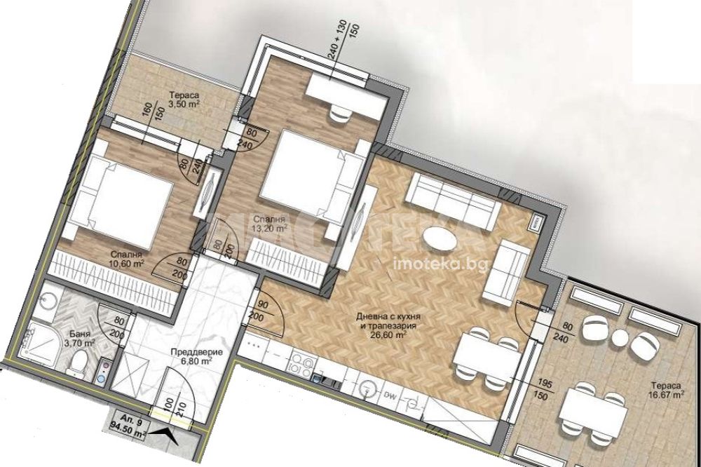 Тристаен апартамент със североизточно изложение и с чиста площ 94,50 кв.м. Състои се от дневна с кухня и трапезария- 26,60 кв.м., две спални съответно по 13,20 кв.м. и 10,60 кв.м., един санитерен възел и две тераси - северна 3,5 кв.м и североизточна - 16,67 кв.м.