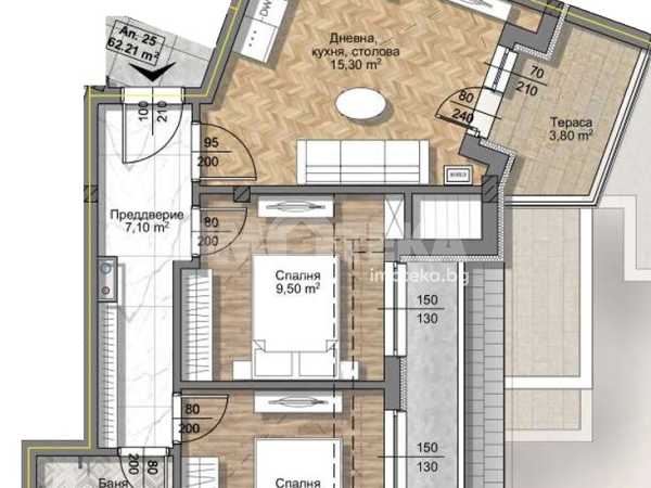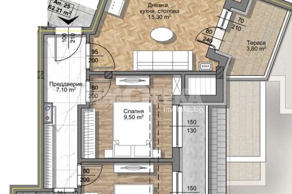 Тристаен апартамент със югоизточно изложение и с чиста площ 62,21 кв.м. Състои се от дневна с кухня и трапезария - 15,30 кв.м., две спални съответно по 9,50 кв.м. и 9,20 кв.м., един санитерен възел, склад и югоизточна тераса 3,80 кв.м.