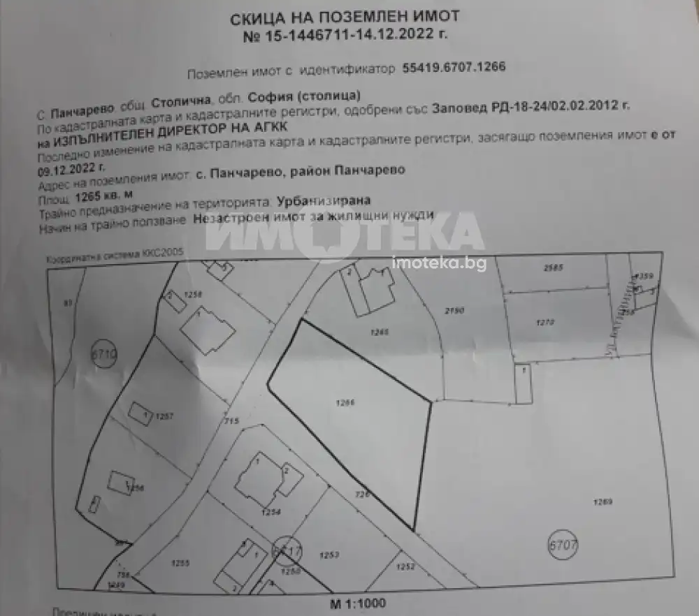 Продава се парцел с площ 1265 кв.м, находящ се в с. Панчарево. Имотът се намира в устройствена зона с преобладаващо жилищно застрояване и има лице на две улици, което осигурява удобен достъп и допълнителни възможности при застрояване.
